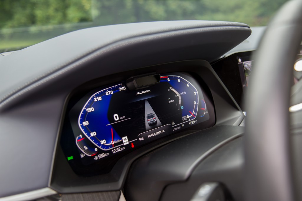 內廂全以Alpina典型的裝飾打扮,中控台上有獨特的廠徽金屬牌匾,而水晶旋鈕式屏幕操控、儀表板和腳墊上亦均有Alpina徽章刻記。電字儀錶組合以Alpina的紫色和藍色主題作為特色,您亦可改用Alpina獨有的桃金孃木面板來裝扮你的機艙,有些人或會覺得深橙色色調有點過時,但它為機艙所帶來的清新魅力感也無可否認。此外,Alpina使用自家名為Lavalina的皮革並以人手打製軚盤,材質比標準Merino皮革略為粗糙,但實際上卻提供更豐富觸感,值得嘉許,值得一提的是,軚盤還鑲有品牌標誌性的藍色和綠色針織縫線。