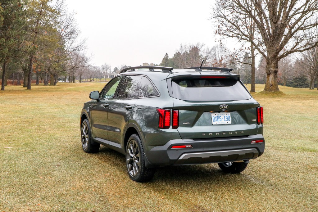 與其說為越野格局就倒不如説以粗獷豪邁為實較為貼切,皆因車頭氣霸(格柵底下),車尾底板和側身底裙所用的灰黑飾板都只會強化此車的越野氣味而非跑車氛圍。車頭設計營造得非常厚實,而車頭冚的貝殼式設計再加上尾方的”Sorento”拱凸字母體無不使人聯想越野天王路虎Land Rover。事實上,外形全是傳統越野車一貫四四方方的外表,很明顯地表達出男性化的個性,這類四驅車根本是沒有討好女性的地方,其設計只表現出一種雄赳赳的剛陽氣慨,全不嬌柔做作。車頭造型厚實大方,而頭燈組銳利的眼神,搭配水箱護罩顯得恰好,呈現出一股越野戰鬥氣息。車側樣貌也同樣飽滿,以剛硬線條顯現出肌肉感,比起上一代的文質彬彬,新Sorento似乎更入世了點。