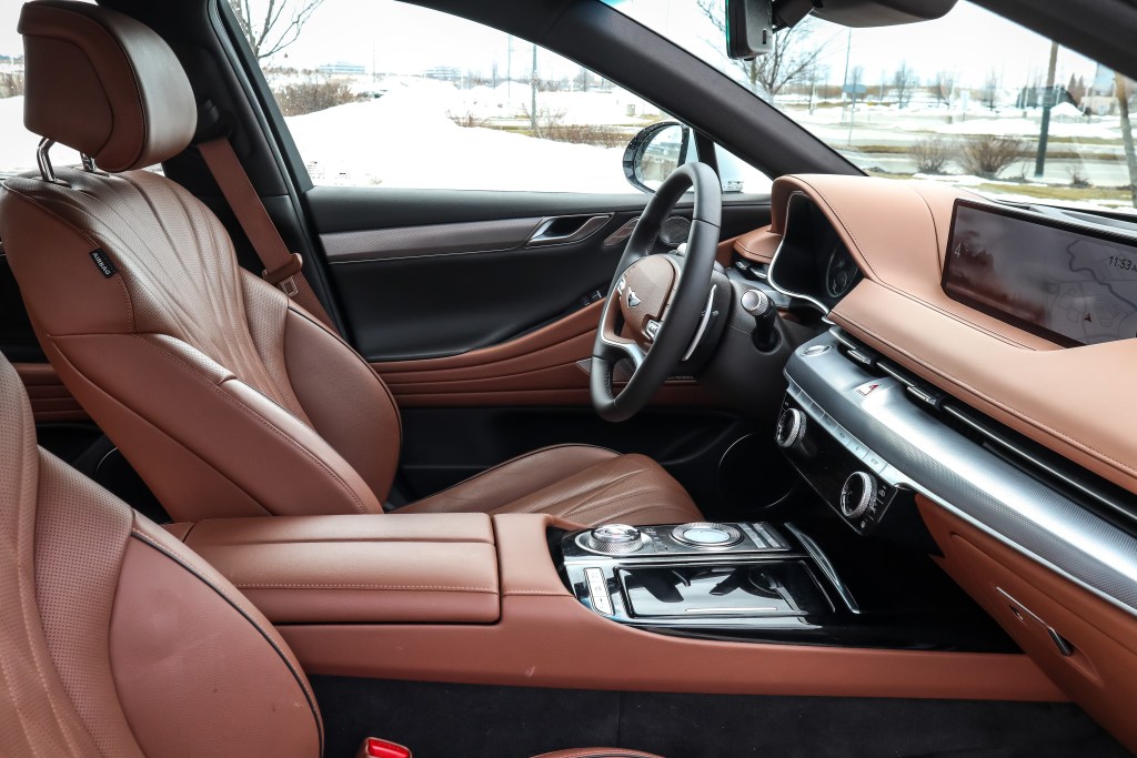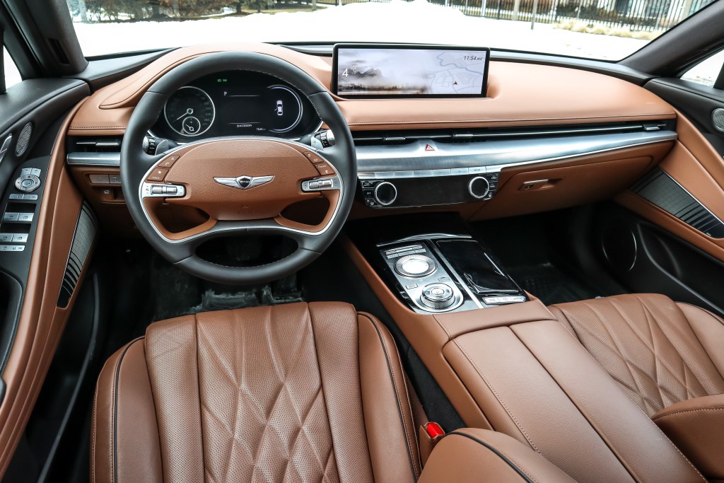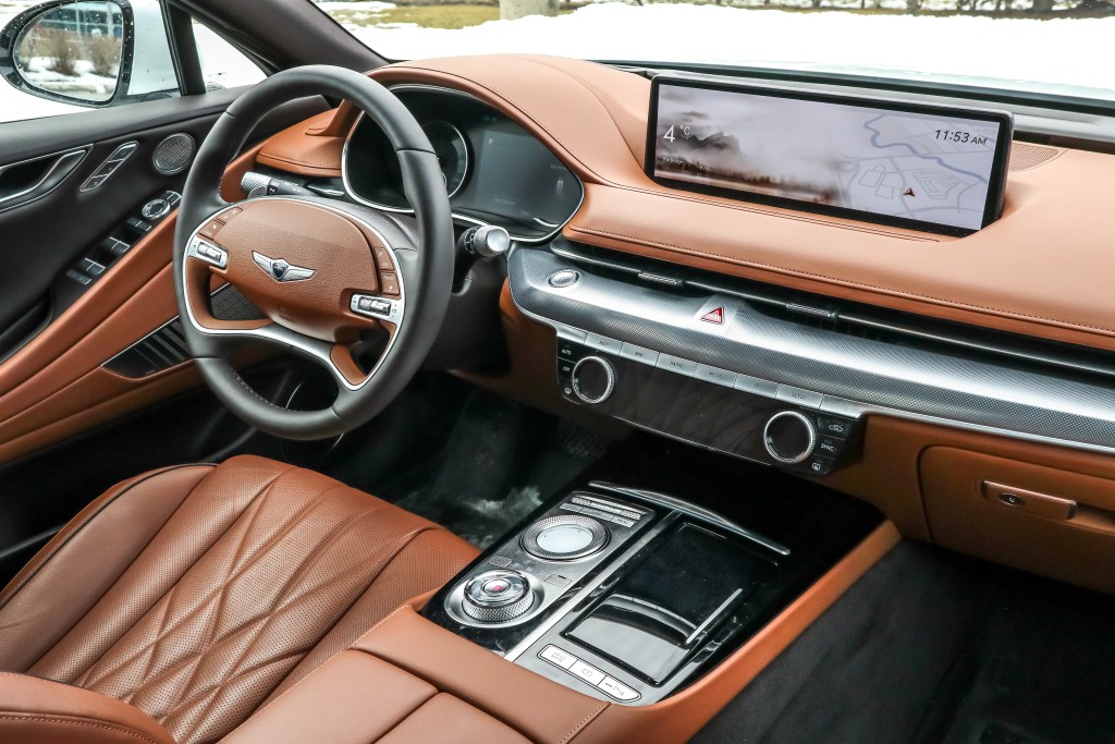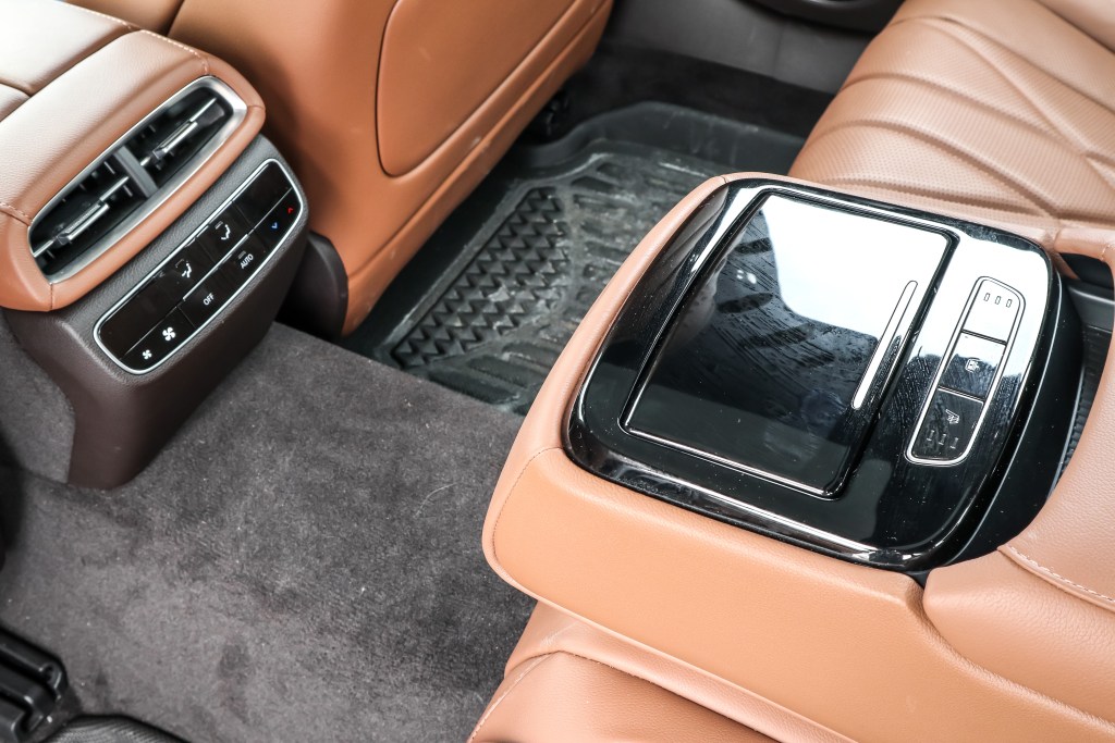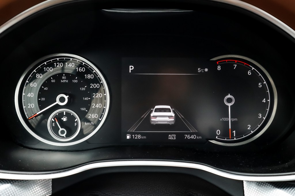 內籠就明顯不是主管外形的設計師負責,卻是由一位較為年邁和保守的師傅所設計,從表板的外觀和設計來看,筆者便不禁有此遐想。T字形的表板模樣是一,平實的中控台和儀表組合設是二,但有14.5寸大、解像度為2,560×720之高清觸控式大芒卻色彩鮮豔明亮。不明白設計師為何不在G80上套用一如G90的行針時鐘,但無論是實木裝飾抑或全以皮革包裹的平台,材質之上乘媲美德國三寶的旗艦代表。