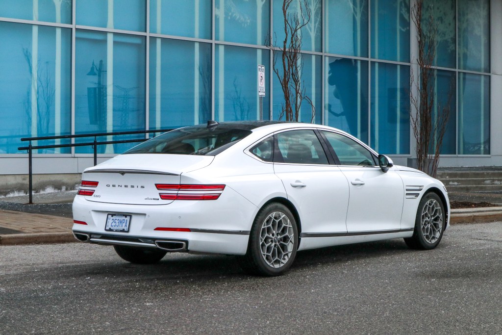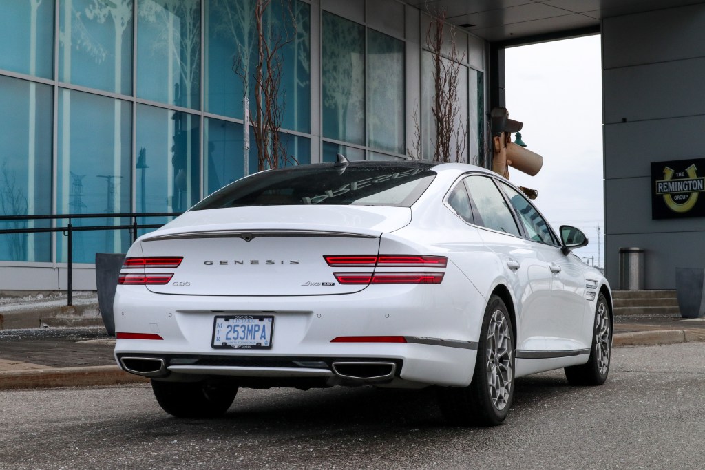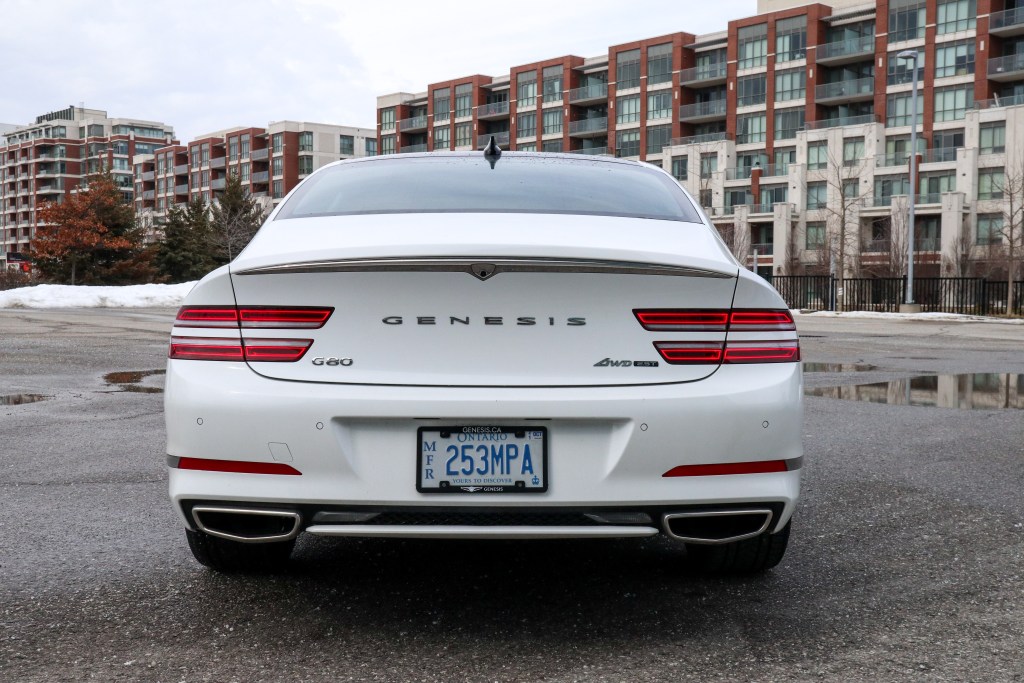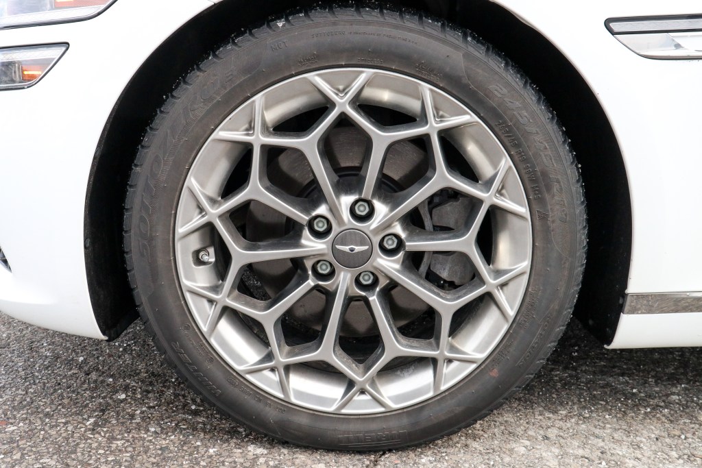 在此豪華轎車層面上,AWD四驅系統是必然裝置,G80亦不例外。在正常乾爽路面之下,後軸後輪持有最多動力分配,這樣軚感及其所傳遞的訉息是最完美的了,保持高楷車應有的氣度與派頭。遇路面有所變化之時,系統會依據從各路感應器所得資料如轉向角度和橫向速度等等從而將動力適當地分配,即使是冰雪,濕滑或沙石路面上,系統的應對能力不容懷疑,此系統也確保車子隨時隨刻都保持最佳牽引及穩定性能。