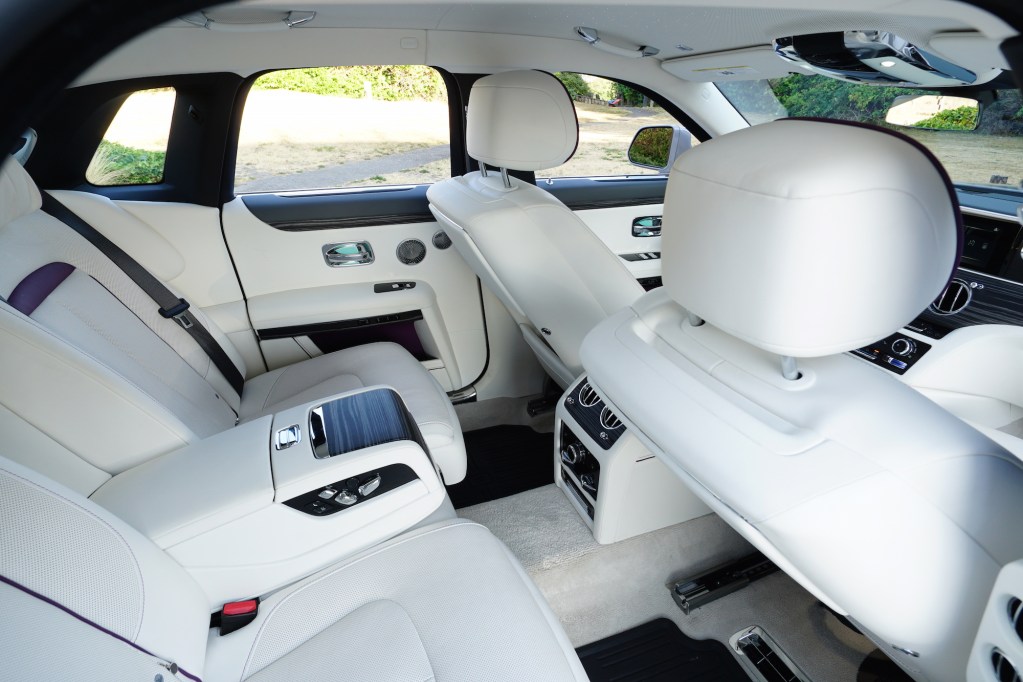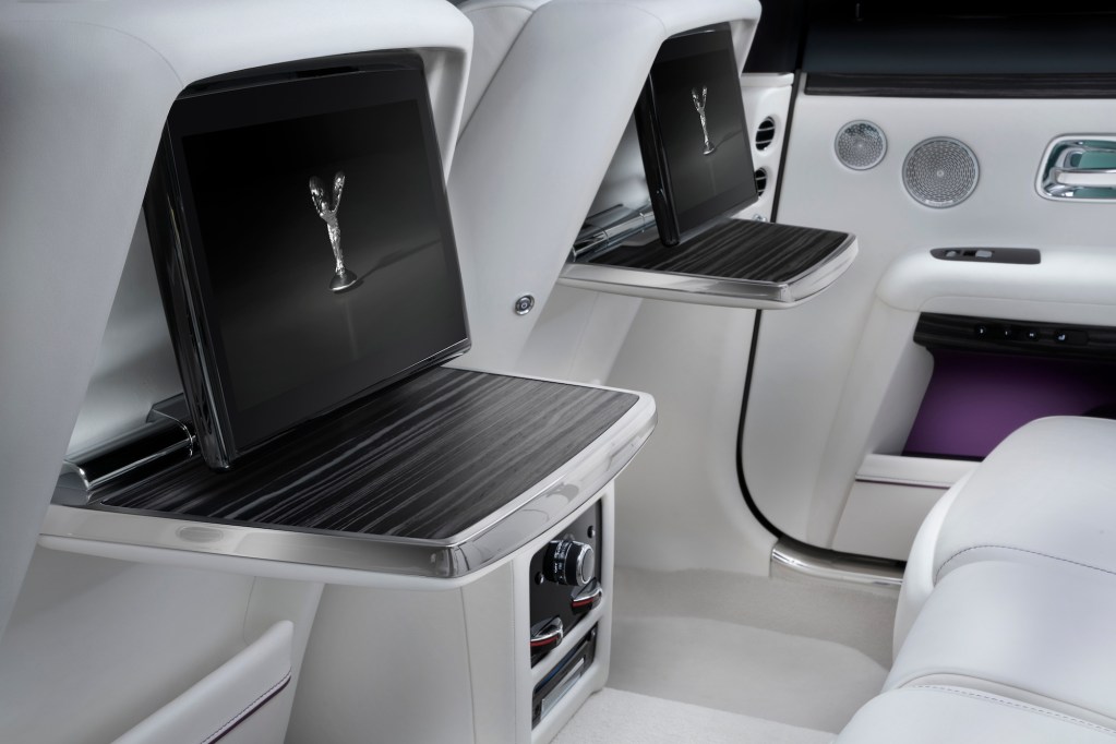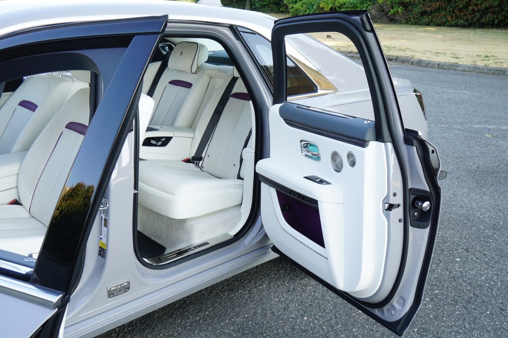 幾能作直角對開的勞斯萊斯車門在新Ghost上更能自動關起。乘客坐上宮廷級後座,關上雙層隔聲玻璃窗後可用前椅背的小摺桌辦公或品嚐從手枕後藏小凍櫃拿出的飲品。無論晝夜,乘客可先見儀錶板右面木飾上的繁星伴著GHOST一字同行。他們若再舉頭更即見似銀河繁星的光纖車廂頂間中有著流星擦過長空。此時能添開懷乘坐享受的莫如那1,300瓦Bespoke音響系統18個喇叭帶上仿如置身音響室裡之與眾不同全音域效果。