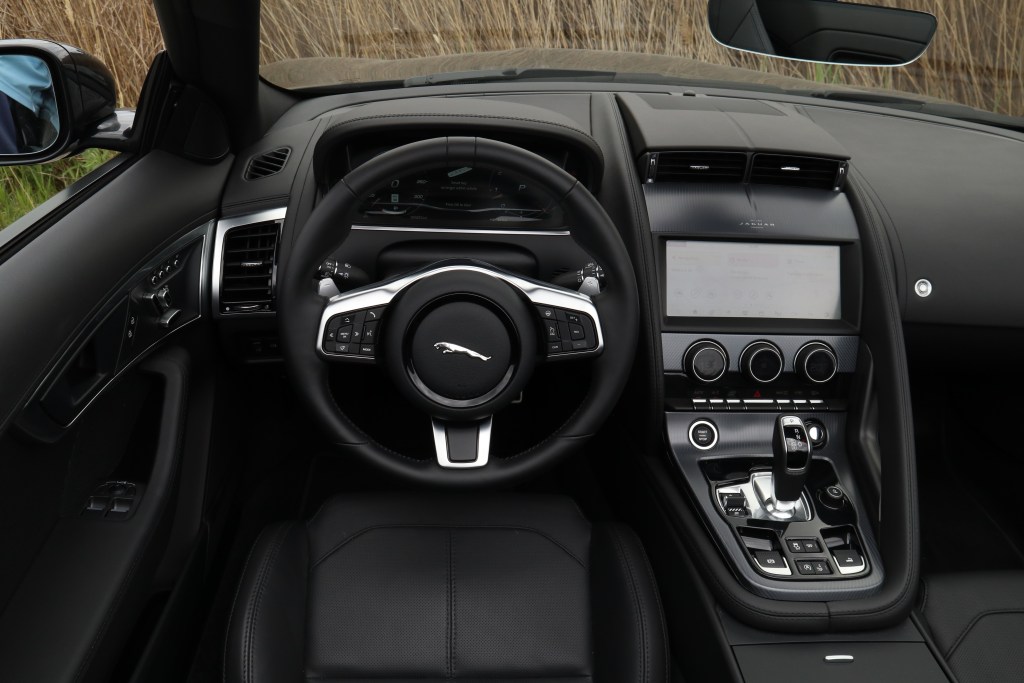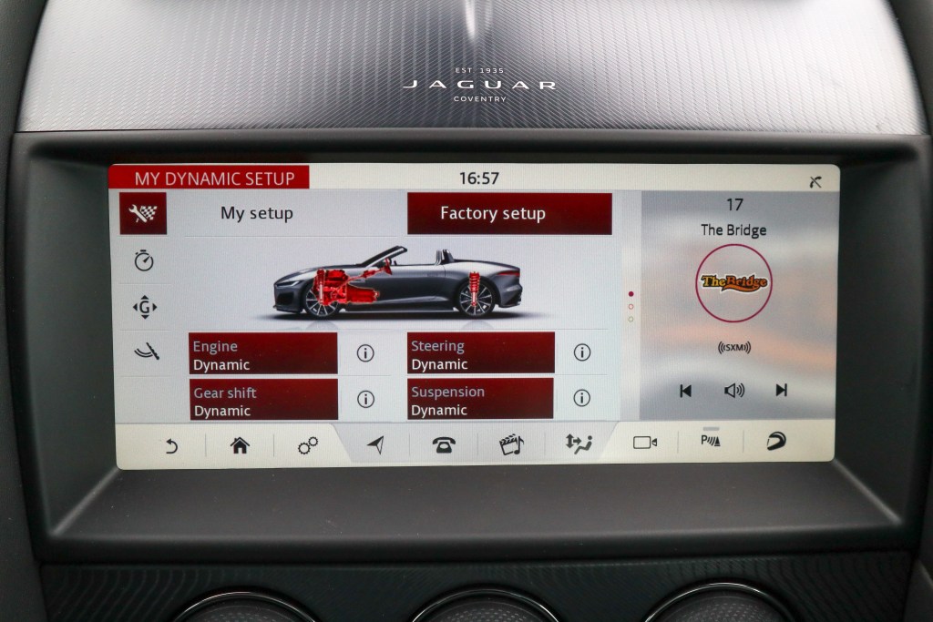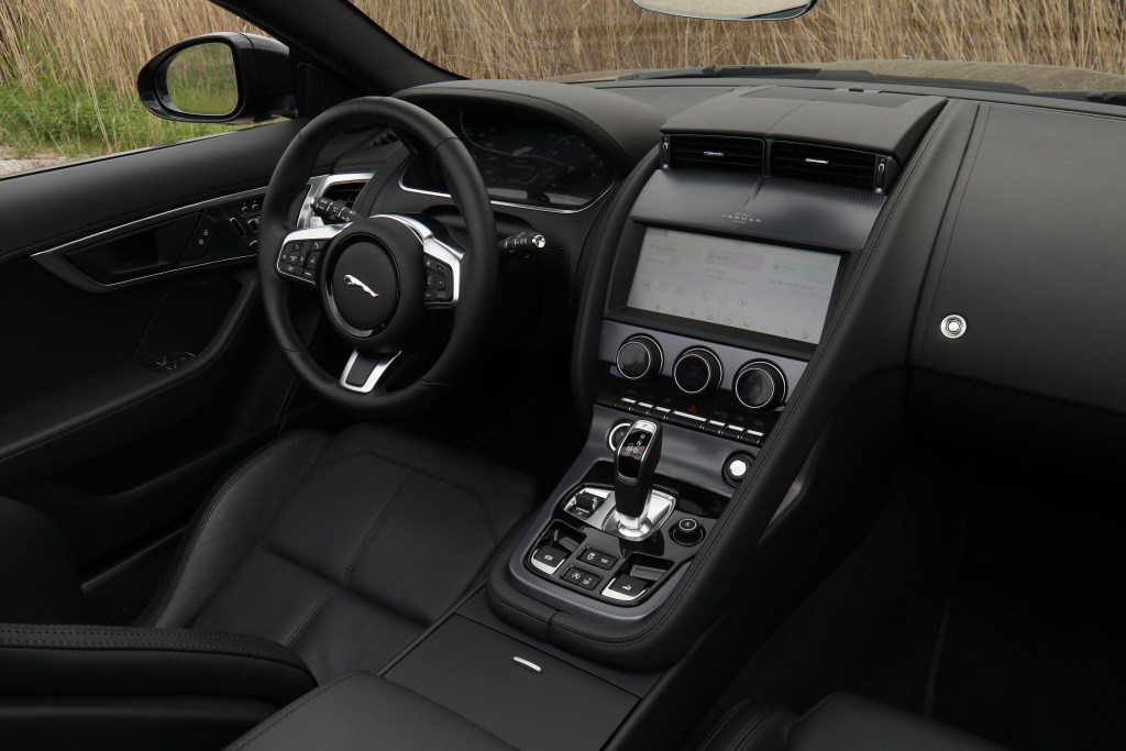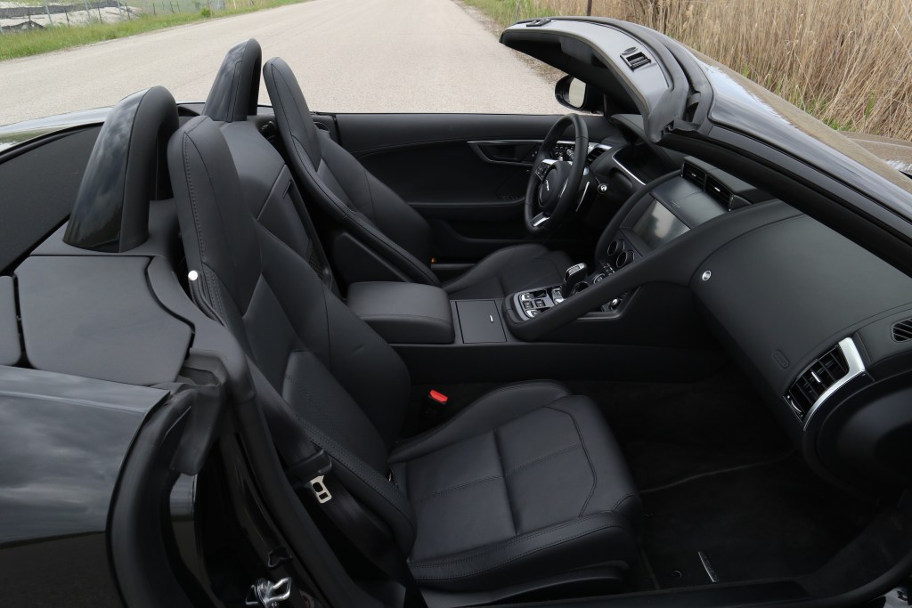 貴為捷豹的跑車代表作,F-TYPE亦凸顯了英國手工藝臣於裝飾和剪裁方面的耍家強項。所有手及之處皆以最優質皮革覆蓋示人。對捷豹長期擁躉來說,L字形錶板平台設計並不陌生,12.3寸HD全液晶儀表板的顯示介面可任由駕駛者隨意更換,而中央亦鑲崁了十寸觸控式顯示幕,藉以表揚自家發展的Jaguar InControl Touch Pro系列,此系列包括InControl Protect(SOS 救急召喚支援,盜失追蹤器)及InControl Remote(透過手機程式監察汽油尚存,續航里數,車門和窗狀況,開關門鎖及泊車位置等等)。喜歡聆聽音樂的亦不妨考慮多付$1,050晉升至770瓦功率12個喇叭7.1 Surround Sound的Meridian環迴音響組合就肯定會令你回味無窮,愛不釋手。