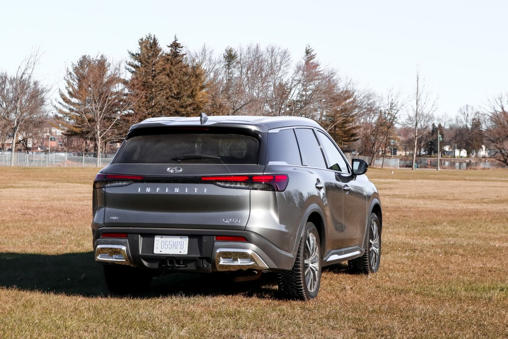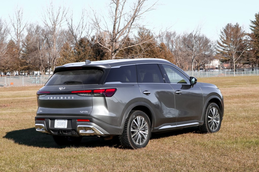 充滿動感及銳利線條的外形設計可説與去年披露的英菲尼迪Monograph Concept概念車別無兩樣,設計手法看似也是以Monograph相同理念將跑車與性能元素融入豪華休旅設計之內,但QX60所凸顯的並不一味霸氣迫人,而是從肌壯線條觀感上散發出優雅氣息以及英菲尼迪血統和基因。標榜著新一代英菲尼迪的全新家族面孔由重新塑造的進氣格柵重新演绎,線條稜角分明,具很高的辨識度,頭燈組銳利的眼神搭配水箱護罩顯得恰好,若非車尾下方兩旁狀如方塊的死氣喉太閃太假的話,觀感定會贏盡筆者掌聲。