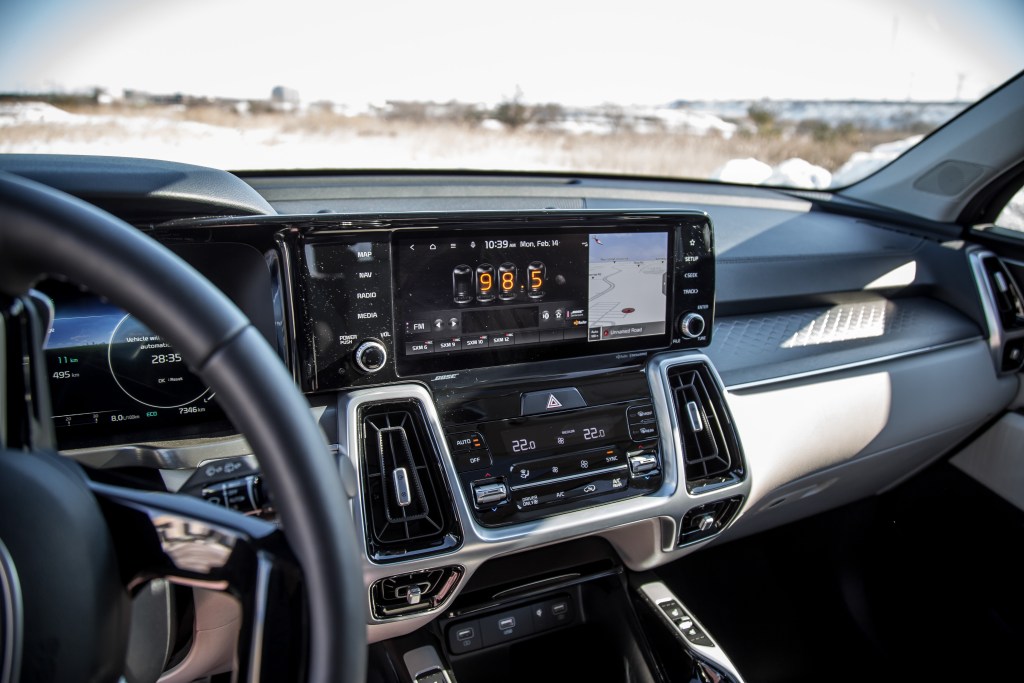 內廂設計已煥然一新,儀錶板和中控台所使用的材質已比前大為改善,其所散發的高質氛圍如門壁及表板裝飾均令人感到猶如置身於名牌房車之內。廠方不僅全面提高Sorento的內廂素質,且還引進了多項同級車中少有的高級裝置,如10.25寸大形觸控式屏幕連12.3寸數碼化儀錶組合(SX型號),HUD投射顯示,真皮椅及功能多多的UVO Intelligence。透過UVO Intelligence手機應用程式On-demand Find My Car,車主可在手機上利用座駕八方攝錄機尋找泊車所在位置,而程式就更附有步行詳細指示,只要泊車不逾兩公里就行。