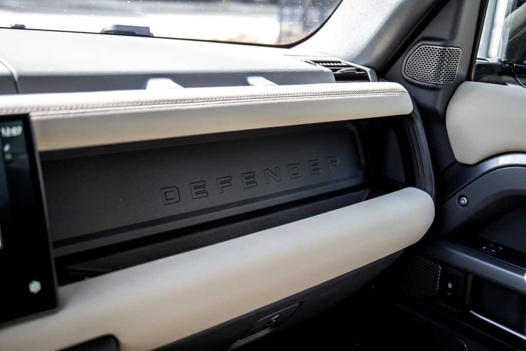 橫跨整幅表板的鎂合金面板很有效地突出內廂的廣闊邊框,而以邊位作為扶手的處理手法就更巧奪天工。從嵌入式表板到觸控顯示屏背後都盡是儲物可用的地方。設計師亦透過裸露的螺釘和粉末塗層陶瓷狀表面來進一步強調Defender的硬派越野個性。