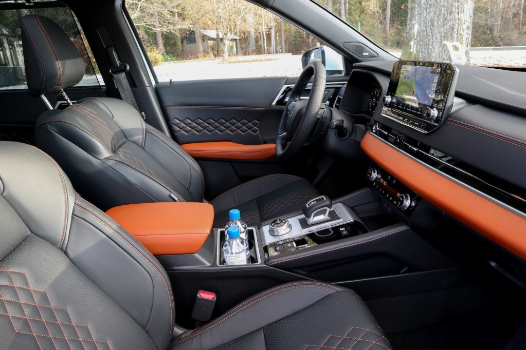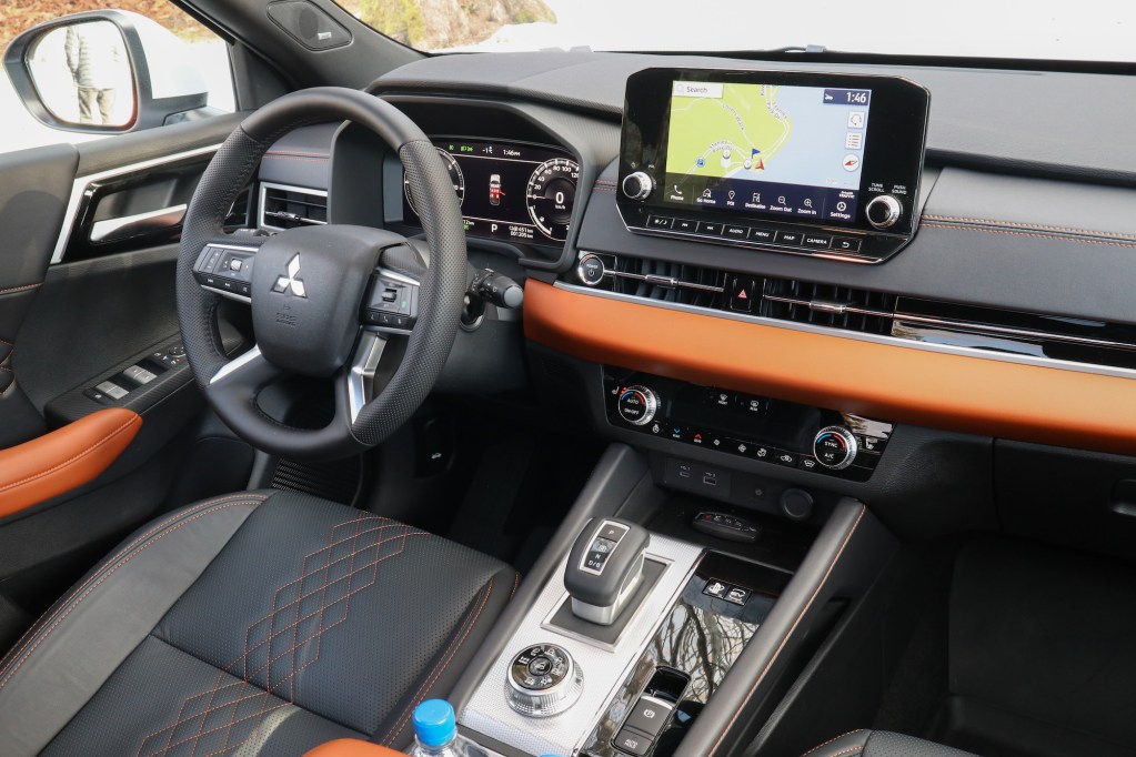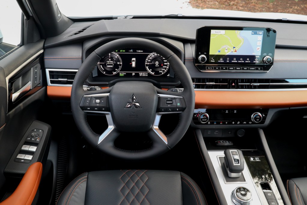 內廂設計亦以全新姿態示人,鋪排和設計全以大型越野車格局作為參考對象,這方面就與起亞Telluride極為神似。儀錶板和中控台所使用的材質已比前大為改善,四幅式密孔軚盤不僅有型有款,手感亦不比德國御三家遜色。廠方不僅全面提高Outlander的內廂素質,且還引進了多項同級車中少有的高級裝置,如12.3寸大形觸控式屏幕連12.3寸數碼化儀錶組合。喜見座椅按摩功能亦出現在PHEV上,為GT Premium型號的專有設備。