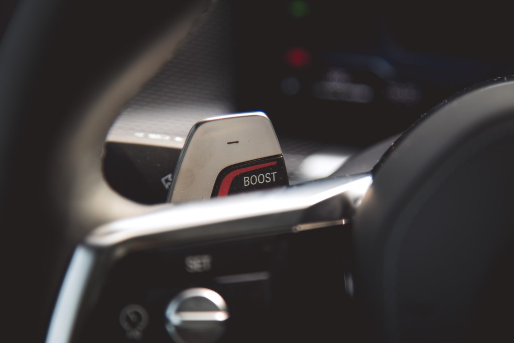 八前速Steptronic Sport自動波箱附上mild hybird系統之後,反應比前大為靈活和敏捷得多,實不須動用軚環撥片,縱然+/-撥片偌大,且左方的”Boost”更可利用電力系統來”爆發”,營造一時之快。由靜止加速至100km/h,身軀龐大的760i僅須4.2秒,尚比全電版i7快了0.5秒(體重分別),全新V8勁度如何就可想而知。