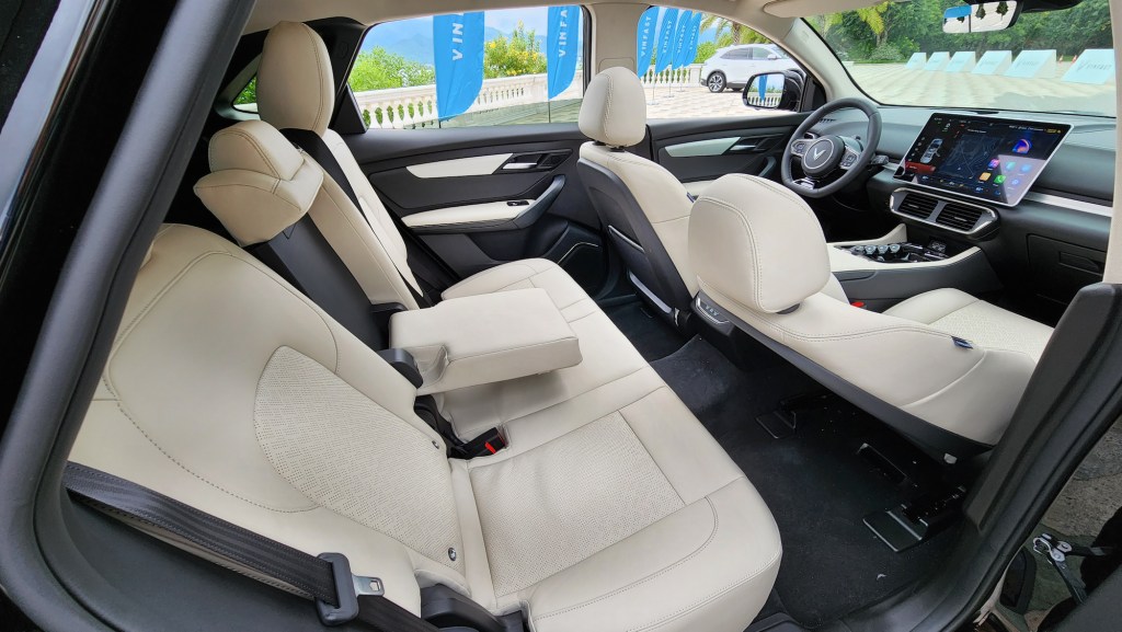 VF8的2,950 mm軸距比韓國對手僅短50 mm。當再加高效之空間利用設計和世界級手功質感,筆者覺得這個車廂舒適程度絕對拍得上同價主流電車。在儀錶板方面VF8就較傾向Model 3之簡化設計,幾乎所有功能均需透過儀錶板中央單一的15.6吋觸敏屏幕來調較。只有音量,門鎖和波箱糸統仍在中控台上設有實體按制。幸好車廂各項調較亦可由聲控來運作。