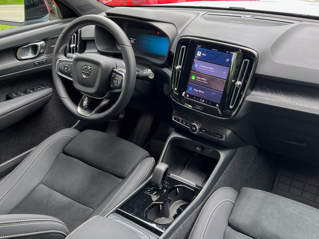 內廂看似與燃油版一式一樣,但正要起行之際發覺start/stop掣全不知去向(在燃油版XC40上原置於軚盤對後右方),不坊先將波箱捍向D下撥看看能否完事,果然就這樣可以起行。原來平時的撻車及熄匙動作經已全免,XC40 Recharge會透過駕駛席感應器來通知樞紐的,起初會有點不慣但一經熟習後便倒覺此正最自然不過的事。