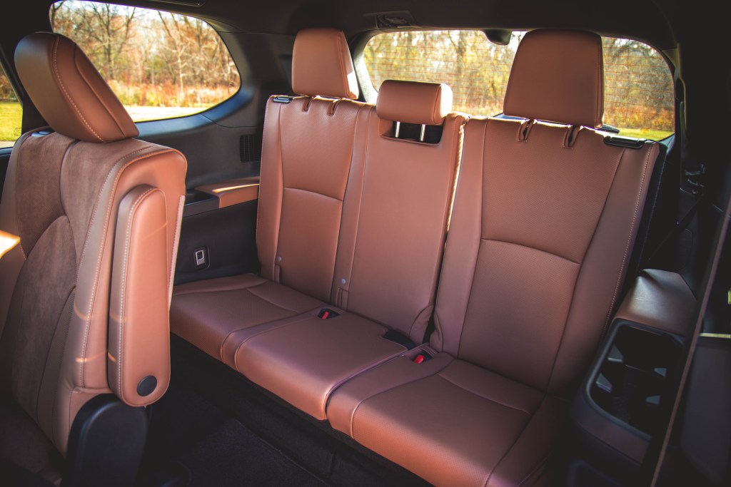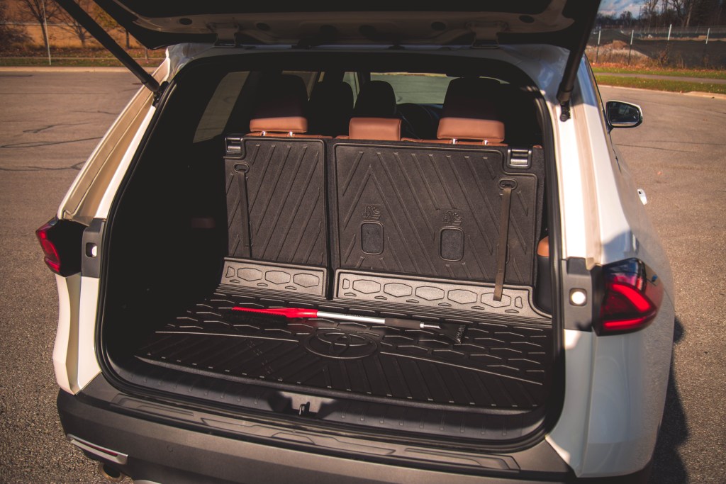 比Highlander加大100毫米的效果在內廂中顯而易見,坐進內廂及放眼後二排座椅空間,感覺儼如置身於一部大型越野車之內。Hybrid MAX中排使用二人式的長官獨立座椅,座背上設快速前傾機關方便後排乘員出入,並提供多節調校為應對後排乘用而前後移動。寬敞有加的第三排座椅沒有電動收摺功能,但收摺完全沒有難度,當不用多載人往來之時及將六四分割的第三排椅背向前扳平之後,載貨量便會從586公升遞增至1,640公升,再將中座扳前之後,載貨空間就隨此擴大至2,761公升。與之比較,Highlander的等同裝載量為456/1,150/2,387公升,而Lexus TX亦於這方面比Grand Highlander稍遜,等同容積為569/1,625公升。