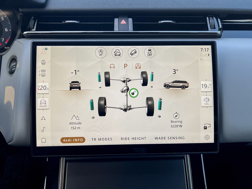 四驅系統以Terrain Response系統作為標準裝配。駕駛者可從屏幕上選擇多項不同的行駛模式,依次為一般狀況,草地/碎石/冰雪路面,泥溝和沙林模式,透過引擎監管系統,波箱控制,電子遁跡系統及ABS,動態穩定操縱系統以及中央差速器,Terrain Response系統便會自動地以最適當的扭力分配及檔位來應付各種駕駛需要。離地距為214mm配了電子氣壓懸掛系統的則205mm),off-road模式下升至251mm,涉水深度為530mm(配了電子氣壓懸掛系統的則為580mm),此外,在off-road模式連氣壓懸掛狀態下,進入角和離去角亦分別有27.5°以及29.5°,足見Velar的越野性能是肯定的,路虎擁躉不用擔心,Velar依然是正正宗宗的Range Rover。