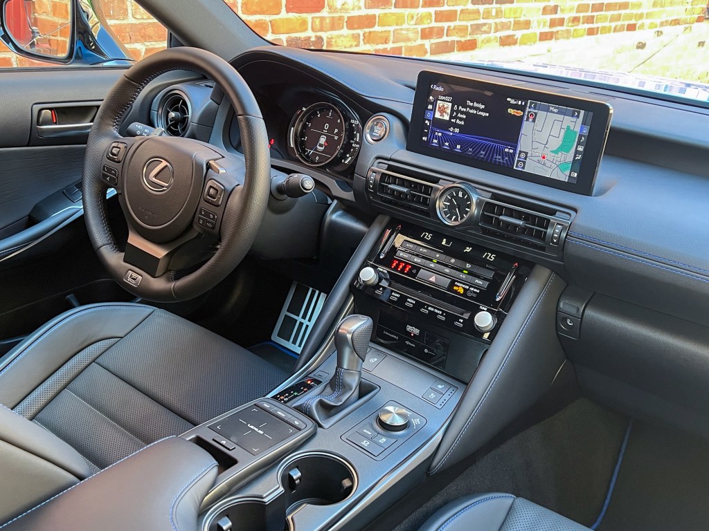 滿以為內廂亦會變成一副像披上盔甲整裝待戰的模樣,但坐進那張舒適無比卻承托力豐厚的F Sport全黑Satin座椅之後,發覺駕駛環境與一般IS分別不大,但就明顯地變得較為嚴謹和著重點綴配襯如在平台,軚環及座椅的白色針織。內廂走向全電子顯示屏的趨勢固然令人特別懷舊,更不願見會發生在IS之上,如是,IS至今仍未摒棄機械性十足,玩味性十足的儀錶便是電芒世界一支奇葩,畢竟,1999年IS的chronograph腕表式儀錶確實太經典太迷人了。儀錶顯示屏為車主提供的資訊有扭力分布圖,G值和賽道圈速計時等等,何時何刻都使人有如置身於職業賽車的感覺。