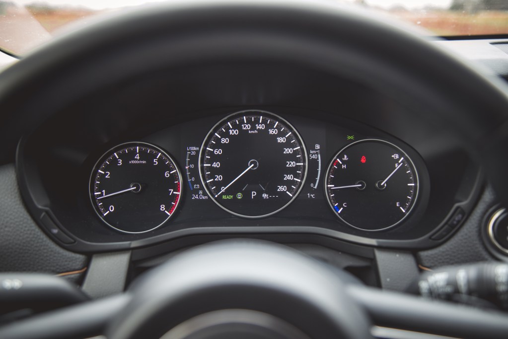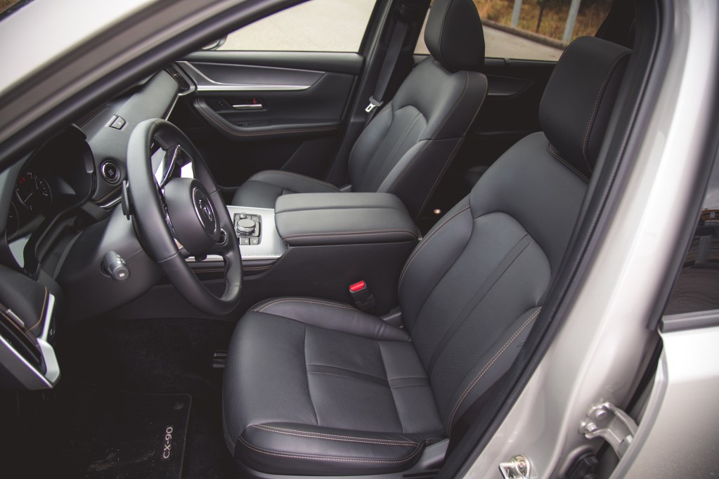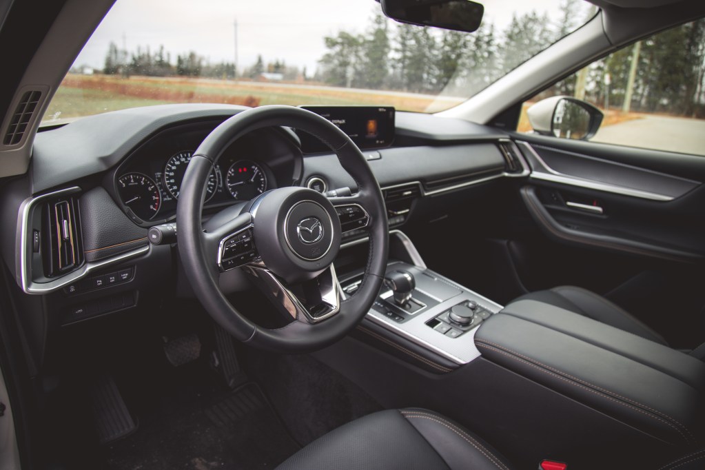 內廂設計已比前大為改善,儀錶板和中控台所使用的材質比前大為提升。今次所試雖非Signature型號,但在最近由AJAC加拿大車評員協會舉辦的Car of the Year/Utility Vehicle of the Year試車大行動中,就曾試了CX-90 Plug-In Hybrid Signature,其皮革表板所散發的高質氛圍便會令人感到猶如置身於名貴房車之內。CX-90仍沿用廠方稱為Human Machine Interface HMI的滑鼠操控介面連同10.25吋大形屏幕的系統,一些日常使用介面如音響,藍牙電話及一般行車設定都可透過HMI來操作之外,其它諸如保養事項,耗油量資訊兼慳油指引以及衛星導航系統等等亦以HMI來負責顯示和操作的。