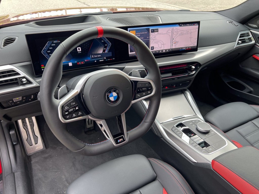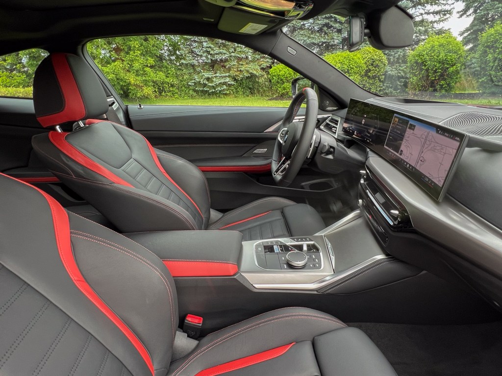 表板由曲面12.3吋儀錶組合及14.9觸控顯示屏作為主導,餐單主頁使用零片層式概念、以導航作為首頁畫面,並在介面上増設QuickSelect快擇選單。新4系亦首次應用AR擴增實境導航作為標配。BMW Operating System作業系統自晉升至8.5代版本之後,車主就能以更快更便捷方式操作,系統現越來越追貼手機使用習慣。平底三幅式軚盤亦是鮮見的,直從i5 M60移植過來,出風口設計也與新5系看齊,改為無外露葉片設計,中央出風口更為可進行多向切換的旋鈕配置、並配有照明光條,實用性並不比舊款佳,但在視覺效果上取勝。
