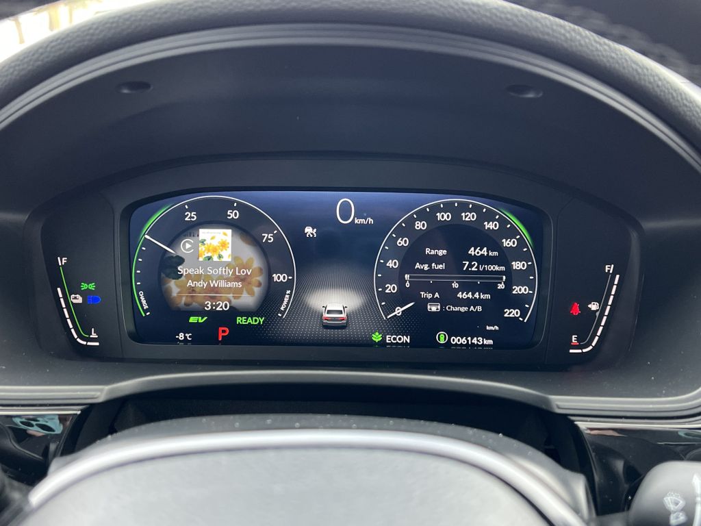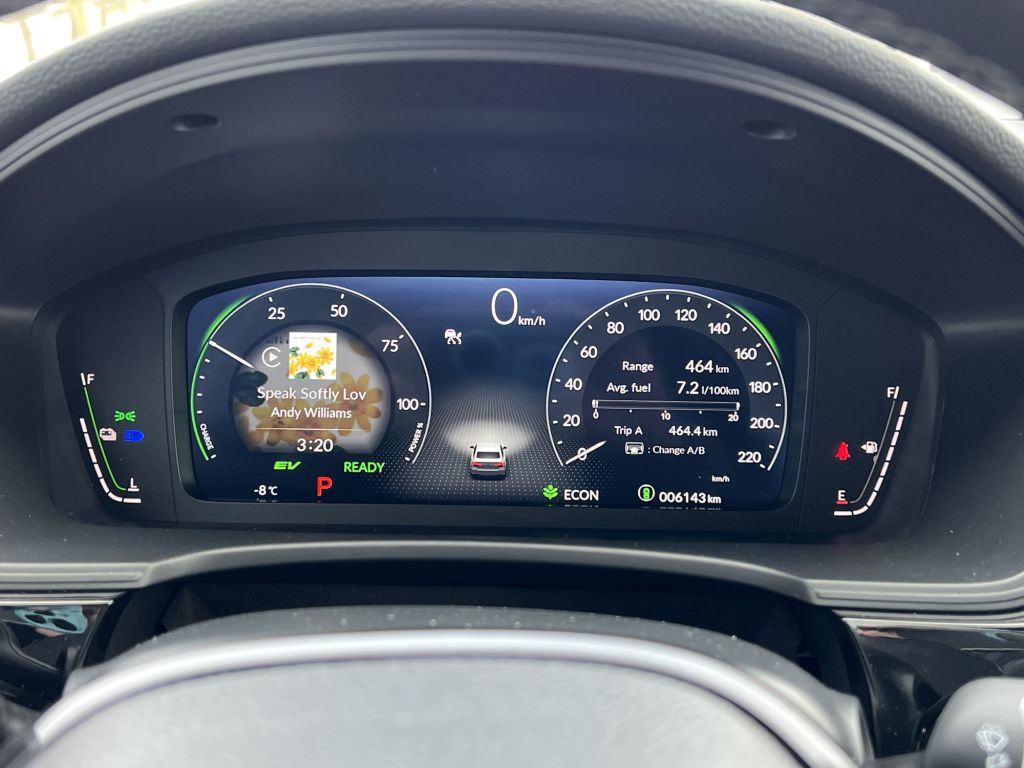 系統雖能慢速時以EV純電方式行駛,但鑑於儲電能量有限,大約一至二公里過後系統便要啟動引擎繼續前進,電池要待煞慢和煞停時段才可利用回收能量來補充電量。Civic Hybrid亦採用最新研發的e-CVT電子控制無段變速系統來提供更為優異的動力傳輸效率表現。除EV模式外,駕駛者亦可透過Drive Mode從Econ/Normal/Sport/Individual不同驅駕模式中選擇最適合的行車需要。