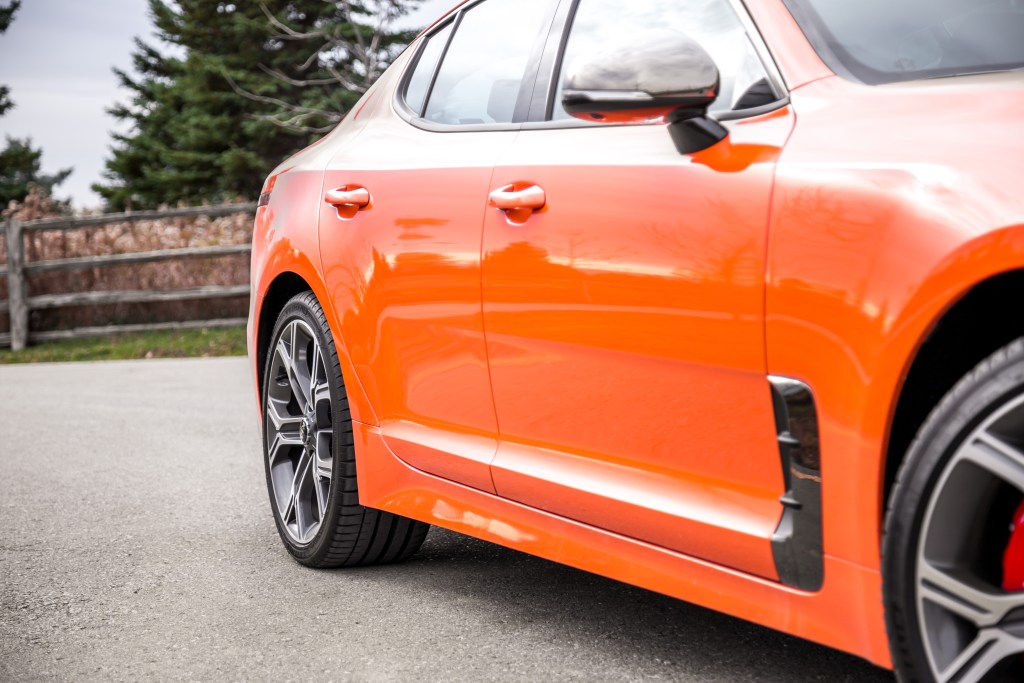 在懸掛調校方面,Stinger GT也有獨自配方如使用跑車避震以及強化前後防傾桿。行駛感不錯是偏硬了點但並沒有導致任何不適的乘坐感。高速行車無論是直航或是過彎斬將,車架都表現得非常紮實穩定。制動系統為Brembo前四後二活塞剎車卡鉗兼備13.8寸前透氣碟和13.4寸後透氣碟, 同等出色的為獨特合金鈴及所裝配的前225/40ZR19後255/35ZR19 Michelin Pilot Sport跑車輪胎。縱然在濕滑路面上狠踏油門,四輪仍是緊抓路面前行,優異的遁跡表現要歸功Stinger GT所用的四輪驅動系統,透過Dynamic Torque Vectoring Control系統,其所搭載的電子限滑差速器除可將最適當的動力分配前方及後方之外,亦能實現了後方左右車輪的動力分配。